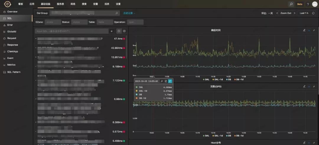 右边 2 个图表给出该条 SQL 在 DAL 中间件层面、 DB 层面的耗时以及调用 QPS。