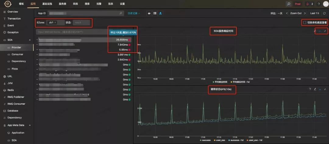 左边一栏列出该应用提供的 SOA 服务接口,同时给出平均响应时间以及和昨天的对比情况。