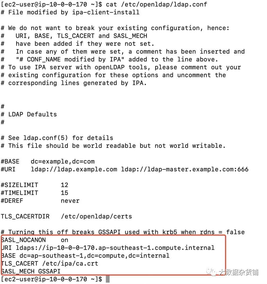 # File modified by ipa-client-install# We do not want to break your existing configuration, hence:# URI, BASE, TLS_CACERT and SASL_MECH# have been added if they were not set.# In case any of them were set, a comment has been inserted and# "# CONF_NAME modified by IPA" added to the line above.# To use IPA server with openLDAP tools, please comment out your# existing configuration for these options and uncomment the# corresponding lines generated by IPA.## LDAP Defaults## See ldap.conf(5) for details# This file should be world readable but not world writable.#BASE dc=example,dc=com#URI ldap://ldap.example.com ldap://ldap-master.example.com:666#SIZELIMIT 12#TIMELIMIT 15#DEREF neverTLS_CACERTDIR /etc/openldap/certs# Turning this off breaks GSSAPI used with krb5 when rdns = falseSASL_NOCANON onURI ldaps://ip-10-0-0-170.ap-southeast-1.compute.internalBASE dc=ap-southeast-1,dc=compute,dc=internalTLS_CACERT /etc/ipa/ca.crtSASL_MECH GSSAPI[ec2-user@ip-10-0-0-170 ~]$