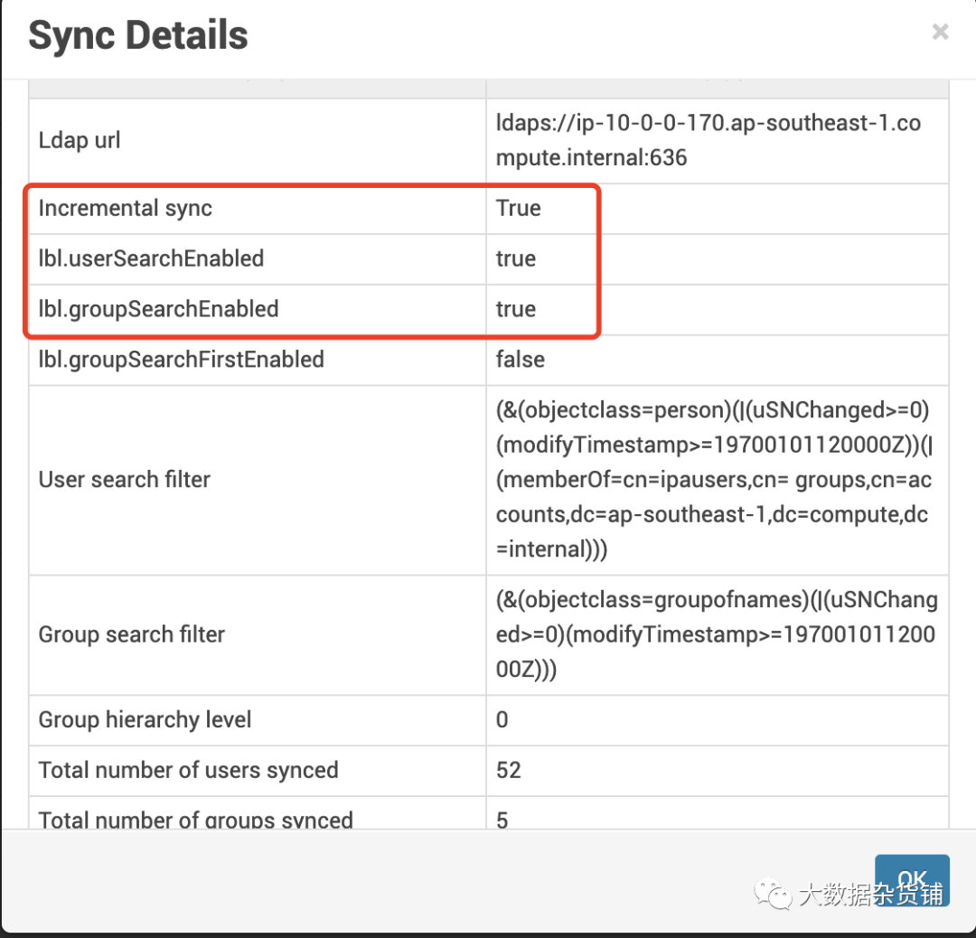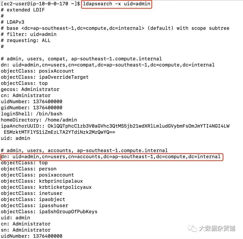 [ec2-user@ip-10-0-0-170 ~]$ ldapsearch -x uid=admin# extended LDIF## LDAPv3# base <dc=ap-southeast-1,dc=compute,dc=internal> (default) with scope subtree# filter: uid=admin# requesting: ALL## admin, users, compat, ap-southeast-1.compute.internaldn: uid=admin,cn=users,cn=compat,dc=ap-southeast-1,dc=compute,dc=internalobjectClass: posixAccountobjectClass: ipaOverrideTargetobjectClass: topgecos: Administratorcn: AdministratoruidNumber: 1376400000gidNumber: 1376400000loginShell: /bin/bashhomeDirectory: /home/adminipaAnchorUUID:: OklQQTphcC1zb3V0aGVhc3QtMS5jb21wdXRlLmludGVybmFsOmJmYTI4NGI4LWE5MzktMTFlYS1iZmEzLTA2YTdiNzk2MzQwYQ==uid: admin# admin, users, accounts, ap-southeast-1.compute.internaldn: uid=admin,cn=users,cn=accounts,dc=ap-southeast-1,dc=compute,dc=internalobjectClass: topobjectClass: personobjectClass: posixaccountobjectClass: krbprincipalauxobjectClass: krbticketpolicyauxobjectClass: inetuserobjectClass: ipaobjectobjectClass: ipasshuserobjectClass: ipaSshGroupOfPubKeysuid: admincn: Administratorsn: AdministratoruidNumber: 1376400000gidNumber: 1376400000homeDirectory: /home/adminloginShell: /bin/bashgecos: Administrator# search resultsearch: 2result: 0 Success# numResponses: 3# numEntries: 2[ec2-user@ip-10-0-0-170 ~]$