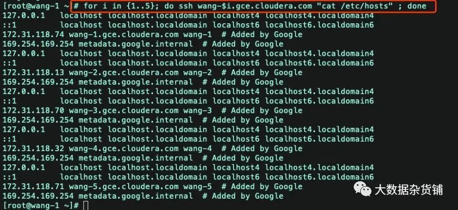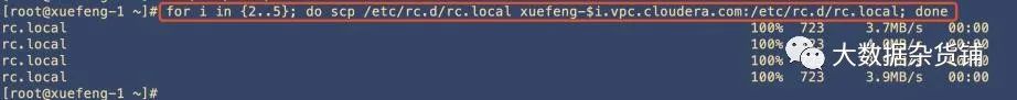 [root@xuefeng-1 ~]# for i in {2..5}; do scp etc/rc.d/rc.local grocery-$i.vpc.cloudera.com:/etc/rc.d/rc.local; donerc.local 100% 723 3.7MB/s 00:00rc.local 100% 723 4.0MB/s 00:00rc.local 100% 723 3.9MB/s 00:00rc.local 100% 723 3.9MB/s 00:00[root@xuefeng-1 ~]#