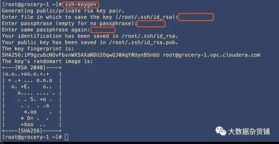 [root@xuefeng-1 ~]# ssh-keygenGenerating public/private rsa key pair.Enter file in which to save the key (/root/.ssh/id_rsa):Enter passphrase (empty for no passphrase):Enter same passphrase again:Your identification has been saved in root/.ssh/id_rsa.Your public key has been saved in root/.ssh/id_rsa.pub.The key fingerprint is:SHA256:RRLaFGHVSxkfwWF/gkY19oWSVSxpZvEbLyXofaW51c0 root@xuefeng-1.vpc.cloudera.comThe key's randomart image is:+---[RSA 2048]----+| B=o.oB@Oo|| = o .**O*o|| . . ..+*+oB|| . o.. BO|| S . =.E|| = || . || || |+----[SHA256]-----+[root@xuefeng-1 ~]#