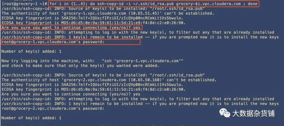 for i in {1..4}; do ssh-copy-id -i ~/.ssh/id_rsa.pub grocery-$i.vpc.cloudera.com ; done