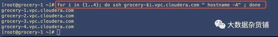 [root@grocery-1 ~]# for i in {1..4}; do ssh grocery-$i.vpc.cloudera.com " hostname -A" ; donegrocery-1.vpc.cloudera.comgrocery-2.vpc.cloudera.comgrocery-3.vpc.cloudera.comgrocery-4.vpc.cloudera.com[root@grocery-1 ~]#