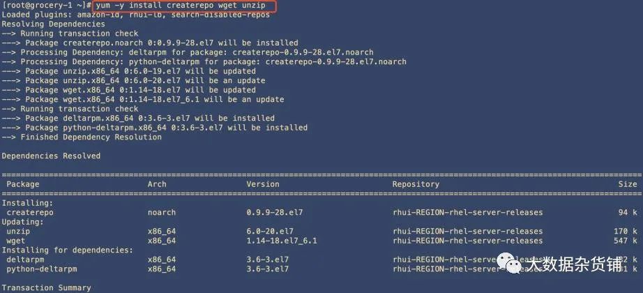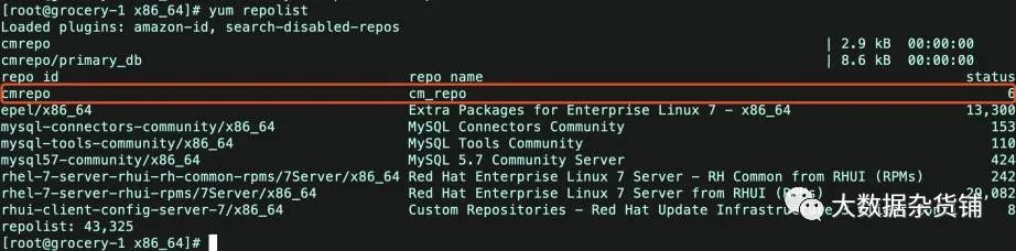 [root@grocery-1 x86_64]# yum repolistLoaded plugins: amazon-id, search-disabled-reposcmrepo | 2.9 kB 00:00:00cmrepo/primary_db | 8.6 kB 00:00:00repo id repo name statuscmrepo cm_repo 6epel/x86_64 Extra Packages for Enterprise Linux 7 - x86_64 13,300mysql-connectors-community/x86_64 MySQL Connectors Community 153mysql-tools-community/x86_64 MySQL Tools Community 110mysql57-community/x86_64 MySQL 5.7 Community Server 424rhel-7-server-rhui-rh-common-rpms/7Server/x86_64 Red Hat Enterprise Linux 7 Server - RH Common from RHUI (RPMs) 242rhel-7-server-rhui-rpms/7Server/x86_64 Red Hat Enterprise Linux 7 Server from RHUI (RPMs) 29,082rhui-client-config-server-7/x86_64 Custom Repositories - Red Hat Update Infrastructure 3 Client Confi 8repolist: 43,325[root@grocery-1 x86_64]#