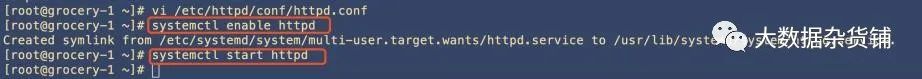 [root@grocery-1 ~]# vi etc/httpd/conf/httpd.conf[root@grocery-1 ~]# systemctl enable httpdCreated symlink from etc/systemd/system/multi-user.target.wants/httpd.service to usr/lib/systemd/system/httpd.service.[root@grocery-1 ~]# systemctl start httpd[root@grocery-1 ~]#