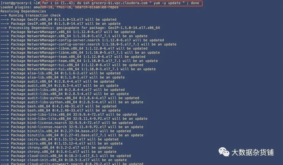 for i in {1..4}; do ssh grocery-$i.vpc.cloudera.com " yum -y update " ; done