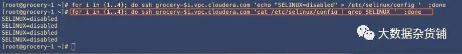 #关闭selinuxfor i in {1..4}; do ssh grocery-$i.vpc.cloudera.com 'echo "SELINUX=disabled" > etc/selinux/config ' ;done