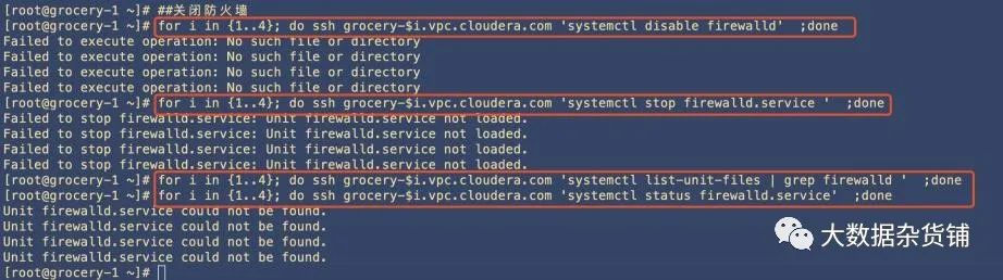 ##关闭防火墙for i in {1..4}; do ssh grocery-$i.vpc.cloudera.com 'systemctl disable firewalld' ;donefor i in {1..4}; do ssh grocery-$i.vpc.cloudera.com 'systemctl stop firewalld.service ' ;donefor i in {1..4}; do ssh grocery-$i.vpc.cloudera.com 'systemctl list-unit-files | grep firewalld ' ;donefor i in {1..4}; do ssh grocery-$i.vpc.cloudera.com 'systemctl status firewalld.service' ;done