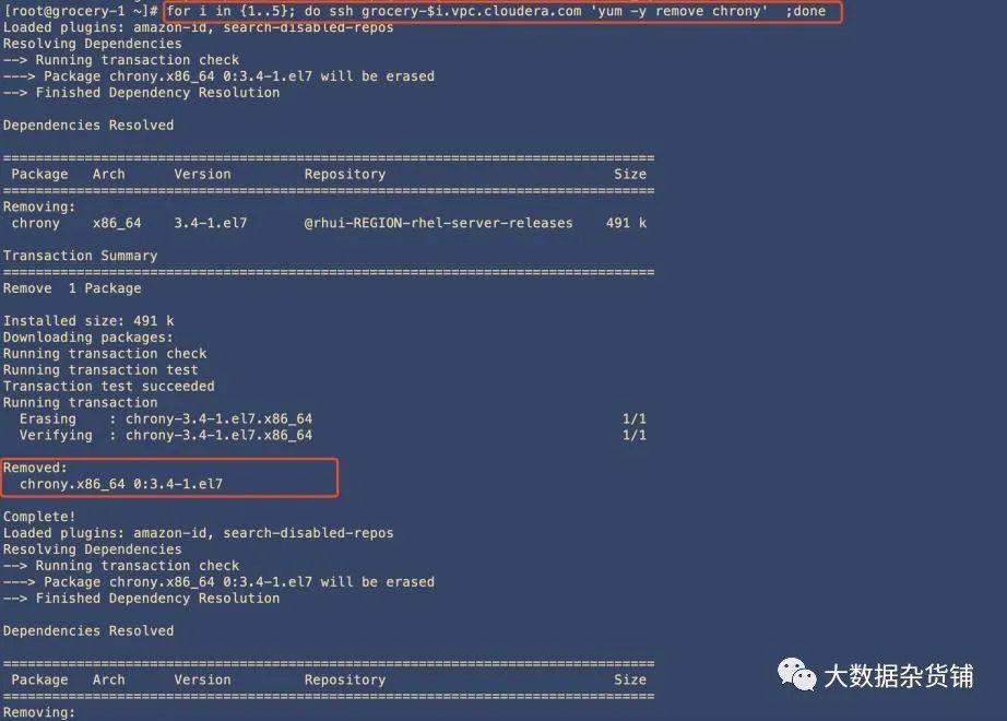 for i in {1..4}; do ssh grocery-$i.vpc.cloudera.com 'yum -y remove chrony' ;done