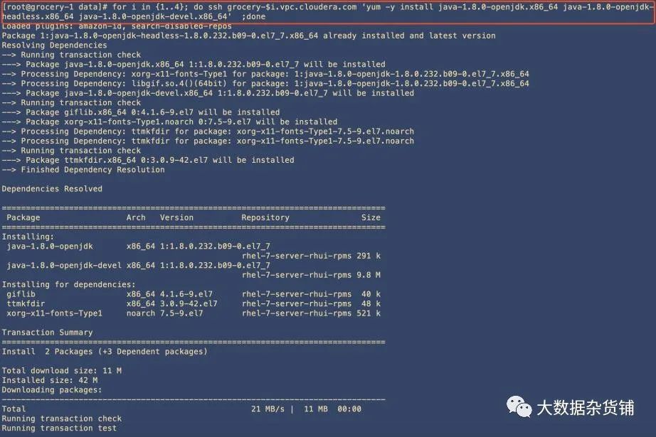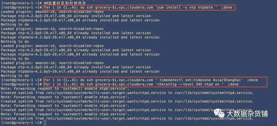 ##设置时区和时钟同步for i in {1..4}; do ssh grocery-$i.vpc.cloudera.com 'yum install -y ntp ntpdate ' ;donefor i in {1..4}; do ssh grocery-$i.vpc.cloudera.com ' timedatectl set-timezone Asia/Shanghai' ;donefor i in {1..4}; do ssh grocery-$i.vpc.cloudera.com 'chkconfig --level 345 ntpd on ' ;done