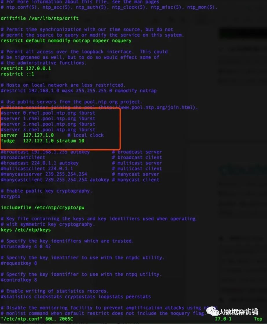 [root@grocery-1 ~]# vim etc/ntp.conf#server 0.rhel.pool.ntp.org iburst#server 1.rhel.pool.ntp.org iburst#server 2.rhel.pool.ntp.org iburst#server 3.rhel.pool.ntp.org iburstserver 127.127.1.0 # local clockfudge 127.127.1.0 stratum 10