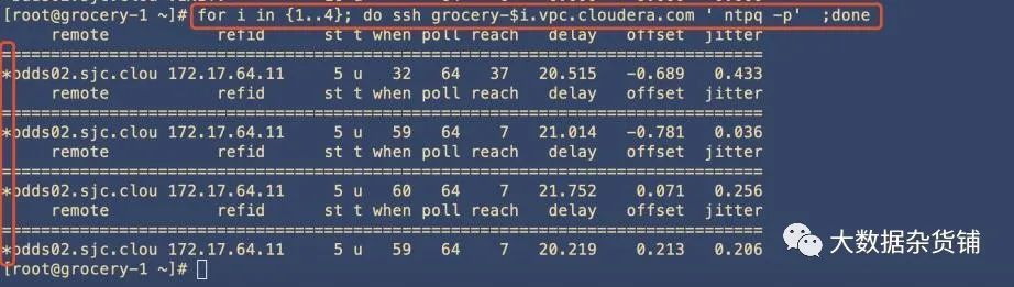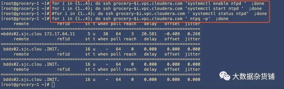 for i in {1..4}; do ssh grocery-$i.vpc.cloudera.com 'systemctl enable ntpd ' ;donefor i in {1..4}; do ssh grocery-$i.vpc.cloudera.com 'systemctl start ntpd ' ;done#for i in {1..4}; do ssh grocery-$i.vpc.cloudera.com ' systemctl status ntpd' ;donefor i in {1..4}; do ssh grocery-$i.vpc.cloudera.com ' ntpq -p' ;done