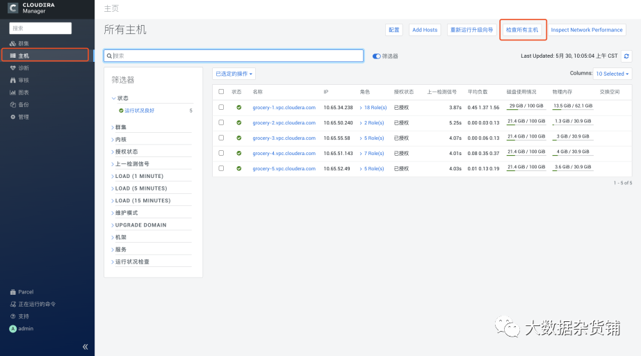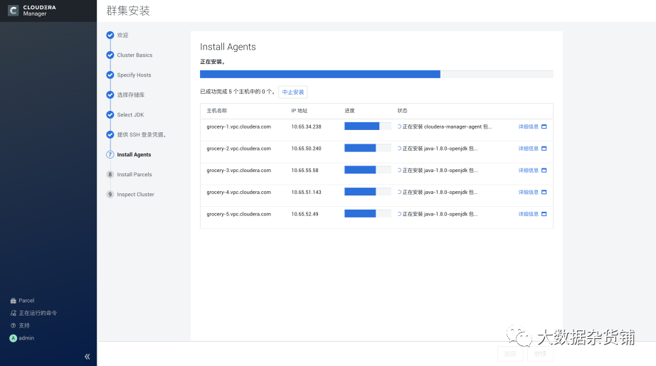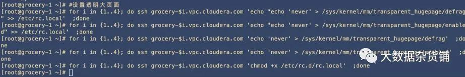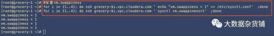 [root@grocery-1 ~]# #设置vm.swappiness[root@grocery-1 ~]# for i in {1..4}; do ssh grocery-$i.vpc.cloudera.com ' echo "vm.swappiness = 1" >> etc/sysctl.conf' ;done[root@grocery-1 ~]# for i in {1..4}; do ssh grocery-$i.vpc.cloudera.com ' sysctl vm.swappiness=1' ;donevm.swappiness = 1vm.swappiness = 1vm.swappiness = 1vm.swappiness = 1[root@grocery-1 ~]#