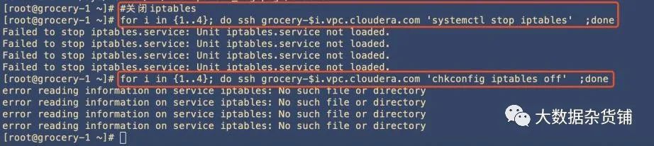 #关闭iptablesfor i in {1..4}; do ssh grocery-$i.vpc.cloudera.com 'systemctl stop iptables' ;donefor i in {1..4}; do ssh grocery-$i.vpc.cloudera.com 'chkconfig iptables off' ;done