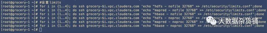 #设置limitsfor i in {1..4}; do ssh grocery-$i.vpc.cloudera.com 'echo "hdfs - nofile 32768" >> etc/security/limits.conf';donefor i in {1..4}; do ssh grocery-$i.vpc.cloudera.com 'echo "mapred - nofile 32768" >> etc/security/limits.conf';donefor i in {1..4}; do ssh grocery-$i.vpc.cloudera.com 'echo "hbase - nofile 32768" >> etc/security/limits.conf';donefor i in {1..4}; do ssh grocery-$i.vpc.cloudera.com 'echo "hdfs - noproc 32768" >> etc/security/limits.conf';donefor i in {1..4}; do ssh grocery-$i.vpc.cloudera.com 'echo "mapred - noproc 32768" >> etc/security/limits.conf';donefor i in {1..4}; do ssh grocery-$i.vpc.cloudera.com 'echo "hbase - noproc 32768" >> etc/security/limits.conf';done
