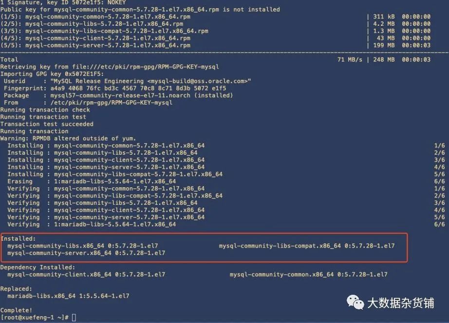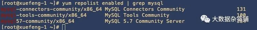 # 检查是否有mysql源[root@xuefeng-1 ~]# yum repolist enabled | grep mysqlmysql-connectors-community/x86_64 MySQL Connectors Community 131mysql-tools-community/x86_64 MySQL Tools Community 100mysql57-community/x86_64 MySQL 5.7 Community Server 384[root@xuefeng-1 ~]#