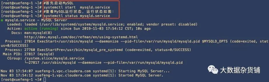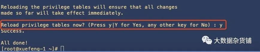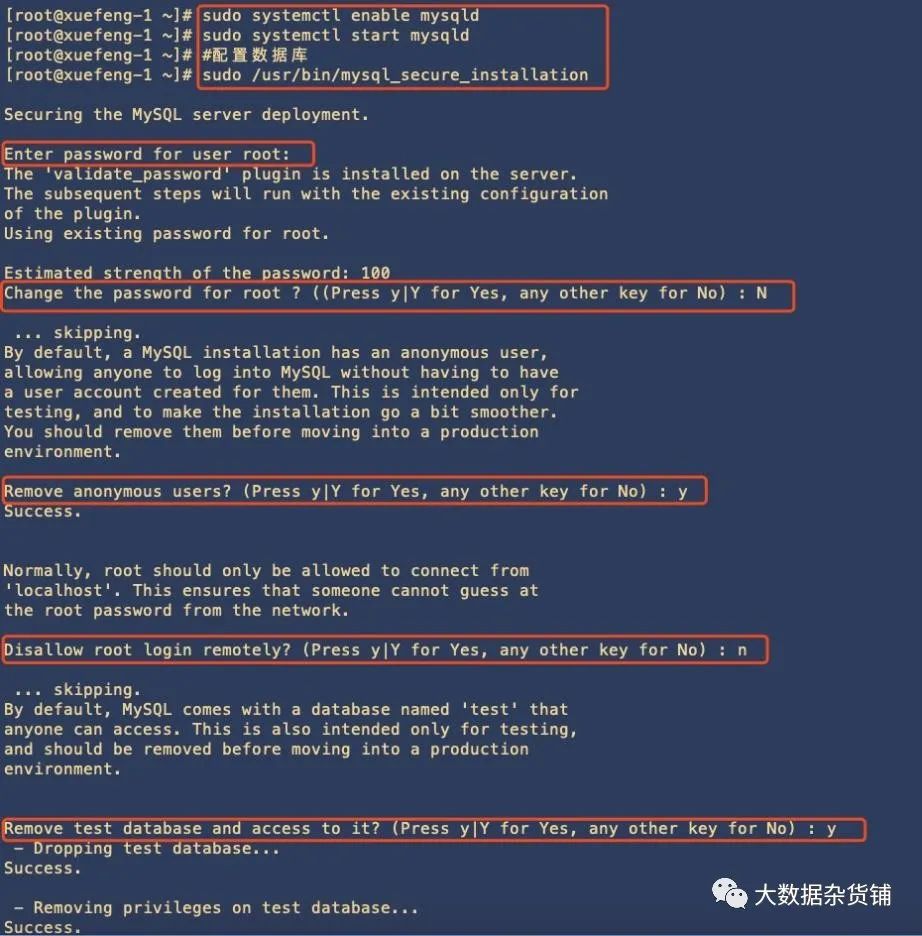 [root@xuefeng-1 ~]# sudo systemctl enable mysqld[root@xuefeng-1 ~]# sudo systemctl start mysqld[root@xuefeng-1 ~]# #配置数据库[root@xuefeng-1 ~]# sudo usr/bin/mysql_secure_installationSecuring the MySQL server deployment.Enter password for user root:The 'validate_password' plugin is installed on the server.The subsequent steps will run with the existing configurationof the plugin.Using existing password for root.Estimated strength of the password: 100Change the password for root ? ((Press y|Y for Yes, any other key for No) : N... skipping.By default, a MySQL installation has an anonymous user,allowing anyone to log into MySQL without having to havea user account created for them. This is intended only fortesting, and to make the installation go a bit smoother.You should remove them before moving into a productionenvironment.Remove anonymous users? (Press y|Y for Yes, any other key for No) : ySuccess.Normally, root should only be allowed to connect from'localhost'. This ensures that someone cannot guess atthe root password from the network.Disallow root login remotely? (Press y|Y for Yes, any other key for No) : n... skipping.By default, MySQL comes with a database named 'test' thatanyone can access. This is also intended only for testing,and should be removed before moving into a productionenvironment.Remove test database and access to it? (Press y|Y for Yes, any other key for No) : y- Dropping test database...Success.- Removing privileges on test database...Success.Reloading the privilege tables will ensure that all changesmade so far will take effect immediately.Reload privilege tables now? (Press y|Y for Yes, any other key for No) : ySuccess.All done![root@xuefeng-1 ~]#