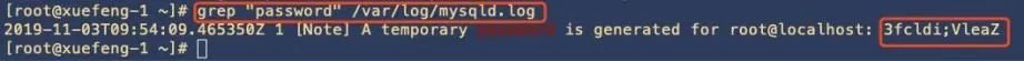 grep "password" var/log/mysqld.log[root@xuefeng-1 ~]# grep "password" var/log/mysqld.log2019-11-03T09:54:09.465350Z 1 [Note] A temporary password is generated for root@localhost: 3fcldi;VleaZ[root@xuefeng-1 ~]#