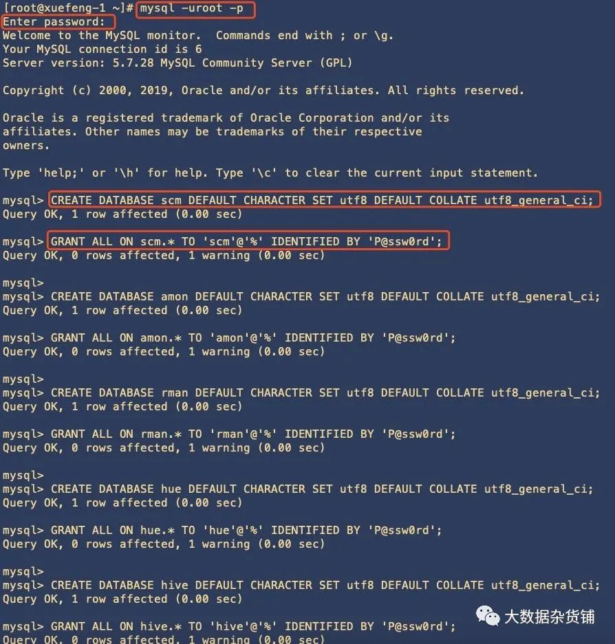 CREATE DATABASE scm DEFAULT CHARACTER SET utf8 DEFAULT COLLATE utf8_general_ci;GRANT ALL ON scm.* TO 'scm'@'%' IDENTIFIED BY 'P@ssw0rd';CREATE DATABASE amon DEFAULT CHARACTER SET utf8 DEFAULT COLLATE utf8_general_ci;GRANT ALL ON amon.* TO 'amon'@'%' IDENTIFIED BY 'P@ssw0rd';CREATE DATABASE rman DEFAULT CHARACTER SET utf8 DEFAULT COLLATE utf8_general_ci;GRANT ALL ON rman.* TO 'rman'@'%' IDENTIFIED BY 'P@ssw0rd';CREATE DATABASE hue DEFAULT CHARACTER SET utf8 DEFAULT COLLATE utf8_general_ci;GRANT ALL ON hue.* TO 'hue'@'%' IDENTIFIED BY 'P@ssw0rd';CREATE DATABASE hive DEFAULT CHARACTER SET utf8 DEFAULT COLLATE utf8_general_ci;GRANT ALL ON hive.* TO 'hive'@'%' IDENTIFIED BY 'P@ssw0rd';CREATE DATABASE ranger DEFAULT CHARACTER SET utf8 DEFAULT COLLATE utf8_general_ci;GRANT ALL ON ranger.* TO 'rangeradmin'@'%' IDENTIFIED BY 'P@ssw0rd';CREATE DATABASE nav DEFAULT CHARACTER SET utf8 DEFAULT COLLATE utf8_general_ci;GRANT ALL ON nav.* TO 'nav'@'%' IDENTIFIED BY 'P@ssw0rd';CREATE DATABASE navms DEFAULT CHARACTER SET utf8 DEFAULT COLLATE utf8_general_ci;GRANT ALL ON navms.* TO 'navms'@'%' IDENTIFIED BY 'P@ssw0rd';CREATE DATABASE oozie DEFAULT CHARACTER SET utf8 DEFAULT COLLATE utf8_general_ci;GRANT ALL ON oozie.* TO 'oozie'@'%' IDENTIFIED BY 'P@ssw0rd';Refresh;