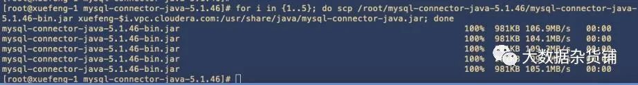for i in {1..5}; do scp root/mysql-connector-java-5.1.46/mysql-connector-java-5.1.46-bin.jar grocery-$i.vpc.cloudera.com:/usr/share/java/mysql-connector-java.jar; done