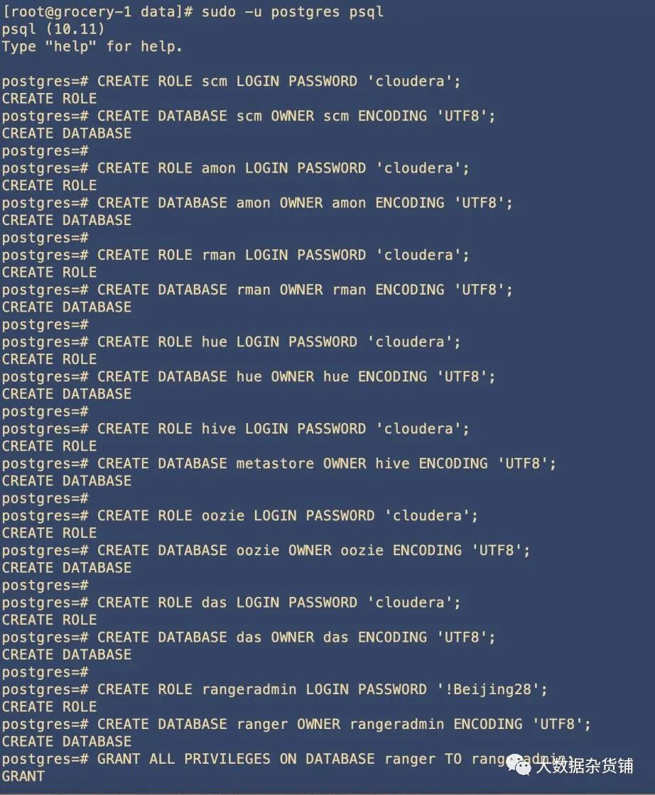 CREATE ROLE scm LOGIN PASSWORD 'cloudera';CREATE DATABASE scm OWNER scm ENCODING 'UTF8';CREATE ROLE amon LOGIN PASSWORD 'cloudera';CREATE DATABASE amon OWNER amon ENCODING 'UTF8';CREATE ROLE rman LOGIN PASSWORD 'cloudera';CREATE DATABASE rman OWNER rman ENCODING 'UTF8';CREATE ROLE hue LOGIN PASSWORD 'cloudera';CREATE DATABASE hue OWNER hue ENCODING 'UTF8';CREATE ROLE hive LOGIN PASSWORD 'cloudera';CREATE DATABASE metastore OWNER hive ENCODING 'UTF8';CREATE ROLE oozie LOGIN PASSWORD 'cloudera';CREATE DATABASE oozie OWNER oozie ENCODING 'UTF8';CREATE ROLE das LOGIN PASSWORD 'cloudera';CREATE DATABASE das OWNER das ENCODING 'UTF8';CREATE ROLE rangeradmin LOGIN PASSWORD '!Beijing28';CREATE DATABASE ranger OWNER rangeradmin ENCODING 'UTF8';GRANT ALL PRIVILEGES ON DATABASE ranger TO rangeradmin;