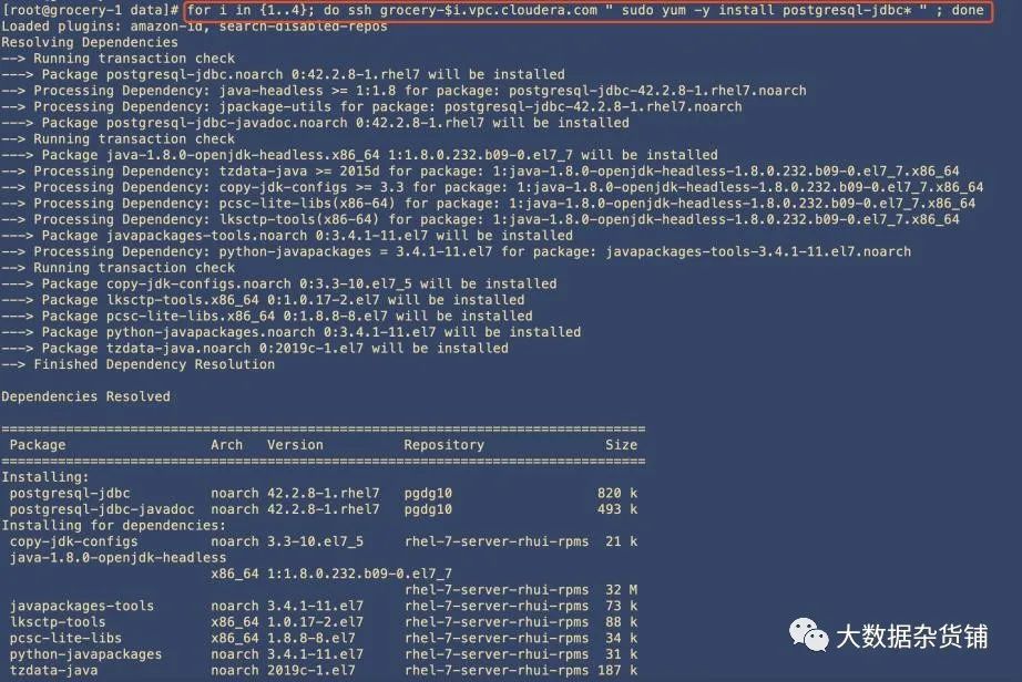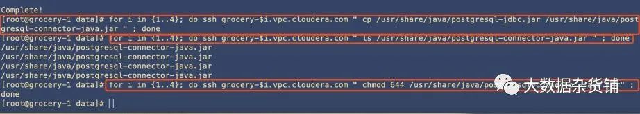 for i in {1..4}; do ssh grocery-$i.vpc.cloudera.com " sudo yum -y install postgresql-jdbc* " ; donefor i in {1..4}; do ssh grocery-$i.vpc.cloudera.com " cp /usr/share/java/postgresql-jdbc.jar /usr/share/java/postgresql-connector-java.jar " ; donefor i in {1..4}; do ssh grocery-$i.vpc.cloudera.com " ls /usr/share/java/postgresql-connector-java.jar " ; donefor i in {1..4}; do ssh grocery-$i.vpc.cloudera.com " chmod 644 /usr/share/java/postgresql-connector-java.jar" ; done