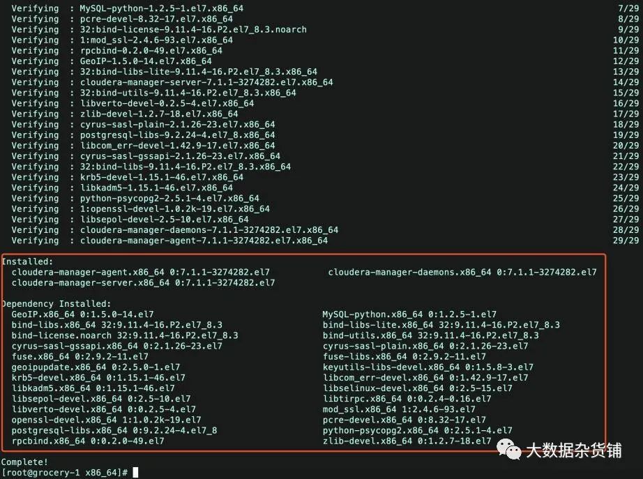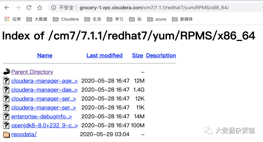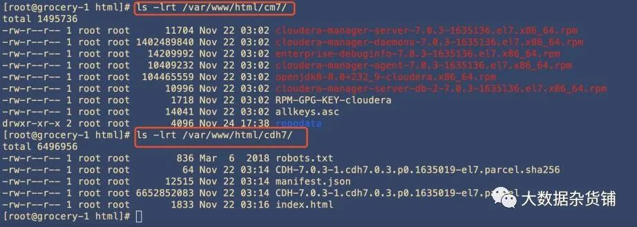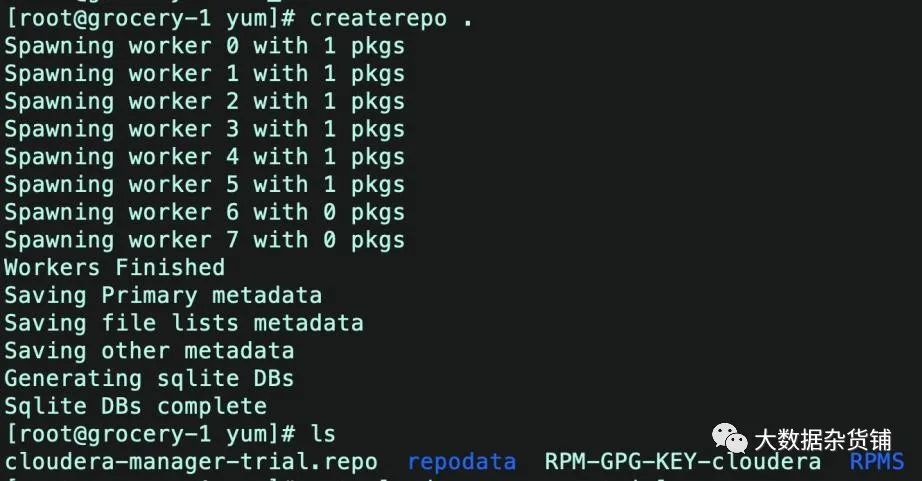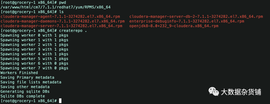[root@grocery-1 x86_64]# pwd/var/www/html/cm7/7.1.1/redhat7/yum/RPMS/x86_64[root@grocery-1 x86_64]# lscloudera-manager-agent-7.1.1-3274282.el7.x86_64.rpm cloudera-manager-server-db-2-7.1.1-3274282.el7.x86_64.rpmcloudera-manager-daemons-7.1.1-3274282.el7.x86_64.rpm enterprise-debuginfo-7.1.1-3274282.el7.x86_64.rpmcloudera-manager-server-7.1.1-3274282.el7.x86_64.rpm openjdk8-8.0+232_9-cloudera.x86_64.rpm[root@grocery-1 x86_64]# createrepo .Spawning worker 0 with 1 pkgsSpawning worker 1 with 1 pkgsSpawning worker 2 with 1 pkgsSpawning worker 3 with 1 pkgsSpawning worker 4 with 1 pkgsSpawning worker 5 with 1 pkgsSpawning worker 6 with 0 pkgsSpawning worker 7 with 0 pkgsWorkers FinishedSaving Primary metadataSaving file lists metadataSaving other metadataGenerating sqlite DBsSqlite DBs complete[root@grocery-1 x86_64]#
