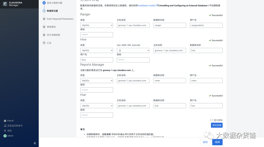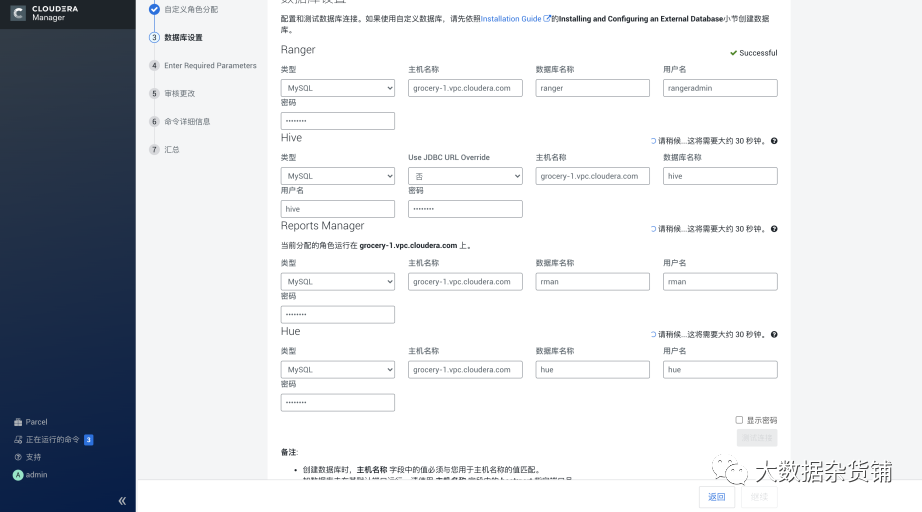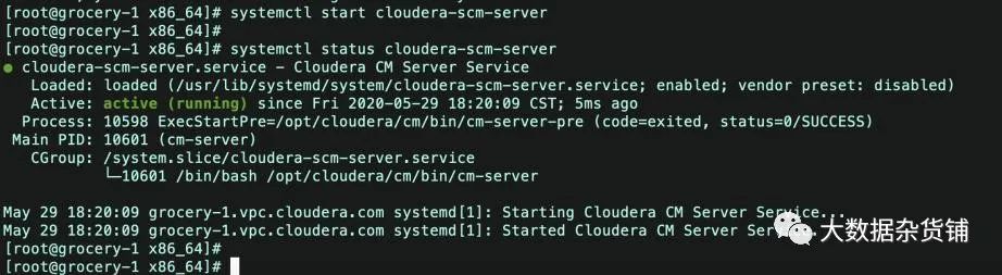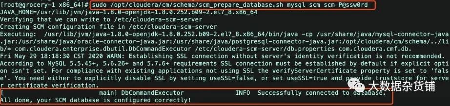 [root@grocery-1 x86_64]# sudo /opt/cloudera/cm/schema/scm_prepare_database.sh mysql scm scm P@ssw0rdJAVA_HOME=/usr/lib/jvm/java-1.8.0-openjdk-1.8.0.252.b09-2.el7_8.x86_64Verifying that we can write to /etc/cloudera-scm-serverCreating SCM configuration file in /etc/cloudera-scm-serverExecuting: /usr/lib/jvm/java-1.8.0-openjdk-1.8.0.252.b09-2.el7_8.x86_64/bin/java -cp /usr/share/java/mysql-connector-java.jar:/usr/share/java/oracle-connector-java.jar:/usr/share/java/postgresql-connector-java.jar:/opt/cloudera/cm/schema/../lib/* com.cloudera.enterprise.dbutil.DbCommandExecutor /etc/cloudera-scm-server/db.properties com.cloudera.cmf.db.Fri May 29 18:18:30 CST 2020 WARN: Establishing SSL connection without server's identity verification is not recommended.According to MySQL 5.5.45+, 5.6.26+ and 5.7.6+ requirements SSL connection must be established by default if explicit option isn't set. For compliance with existing applications not using SSL the verifyServerCertificate property is set to 'false'. You need either to explicitly disable SSL by setting useSSL=false, or set useSSL=true and provide truststore for server certificate verification.[ main] DbCommandExecutor INFO Successfully connected to database.All done, your SCM database is configured correctly![root@grocery-1 x86_64]#