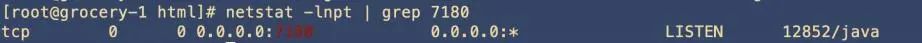 [root@grocery-1 html]# netstat -lnpt | grep 7180tcp 0 0 0.0.0.0:7180 0.0.0.0:* LISTEN 12852/java