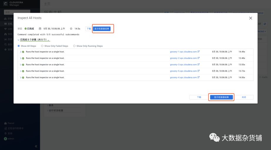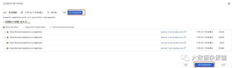 [root@grocery-1 ~]# for i in {2..4}; do ssh grocery-$i.vpc.cloudera.com ' systemctl stop ntpd' ;done[root@grocery-1 ~]# #强制和时钟服务器时间同步,排除自己[root@grocery-1 ~]# for i in {2..4}; do ssh grocery-$i.vpc.cloudera.com ' ntpdate 10.65.51.45' ;done24 Nov 16:12:21 ntpdate[9538]: adjust time server 10.65.51.45 offset 0.000399 sec24 Nov 16:12:27 ntpdate[28877]: adjust time server 10.65.51.45 offset -0.000211 sec24 Nov 16:12:33 ntpdate[28874]: adjust time server 10.65.51.45 offset -0.000204 sec