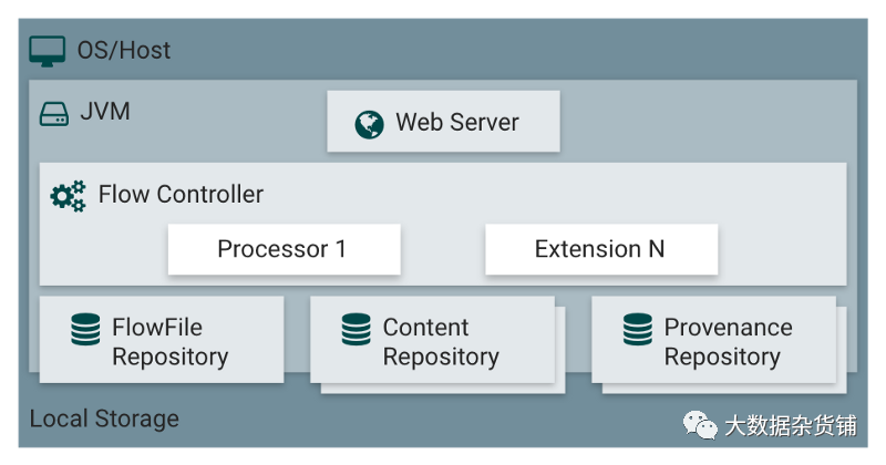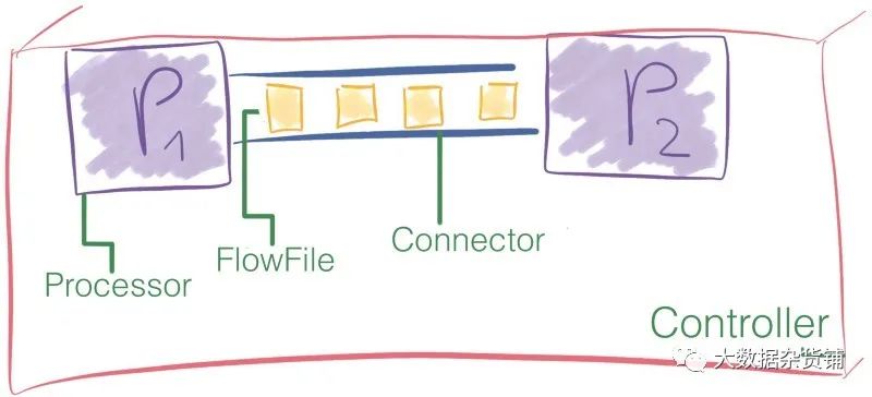 黑匣子称为处理器,它们通过称为连接的队列交换名为FlowFiles的信息块。最后,FlowFile Controller负责管理这些组件之间的资源。