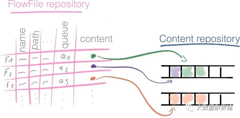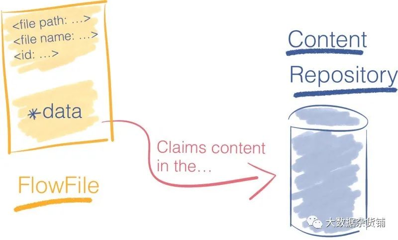 相反,FlowFile保留一个指针,该指针引用存储在本地存储中某个位置的数据。这个地方称为内容存储库 。