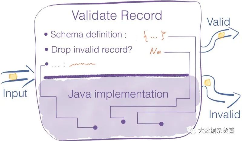 放大NiFi处理器以进行记录验证 -管道构建器指定了高级配置选项,黑框隐藏了实现细节。