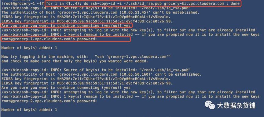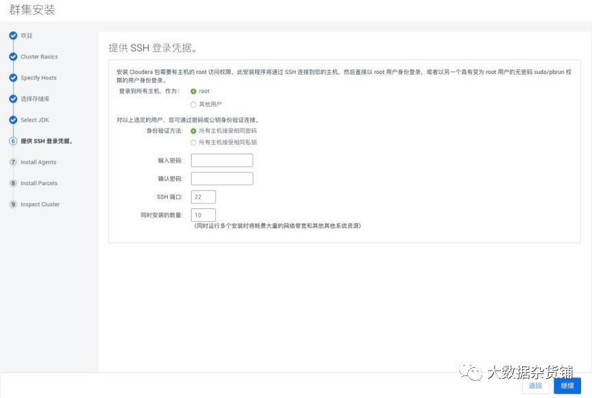 7. 点击“继续”,进入下一步配置ssh账号密码,确保所有机器的root密码都一致,然后输入root的密码即可。