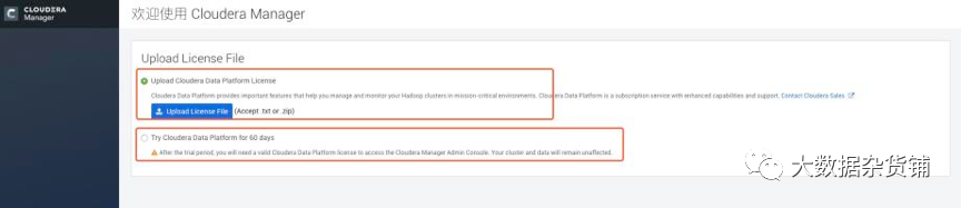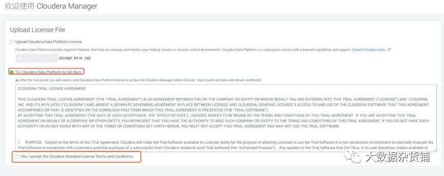 这时有两个选项,一个是上传企业订阅的license,一个是使用60天试用,试用到期后无法访问Cloudera Manager的管理控制台。