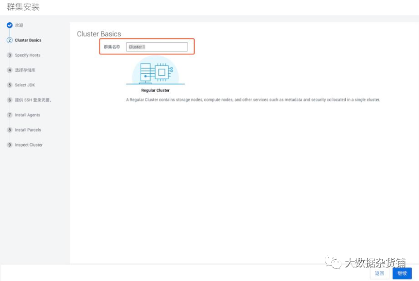 2. 点击“继续”,输入Basic集群的名称,也可以使用默认的”Cluster 1”:
