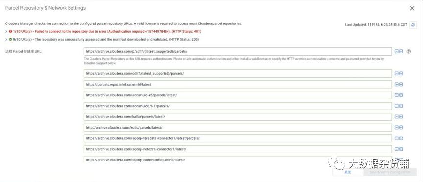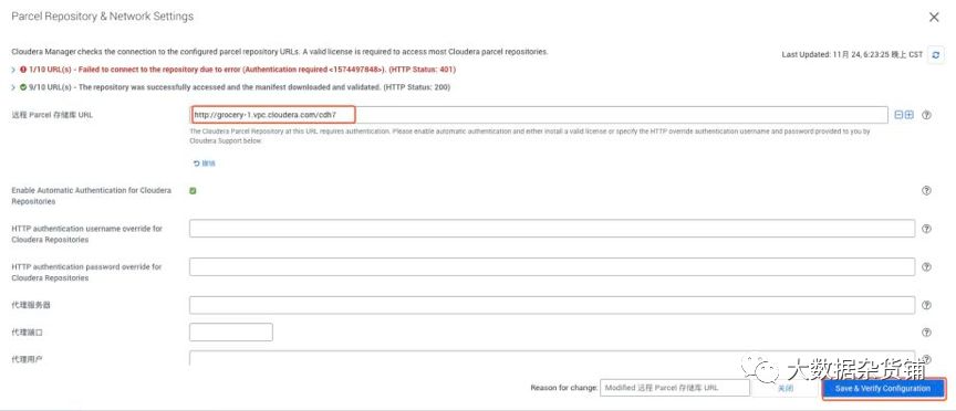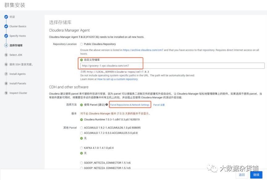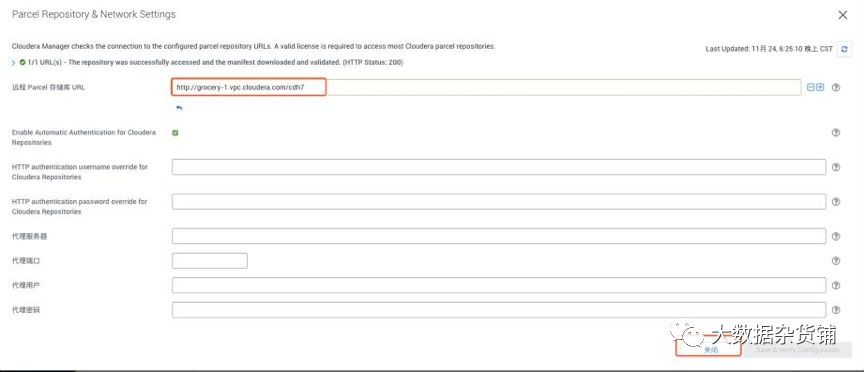 “CDH and other software”中选择“Parcel Repositories & Network Settings”,点击“ 更多选项”,点击“-”删除其它所有地址,输入http://grocery-1.vpc.cloudera.com/cdh7,点击“保存更改”