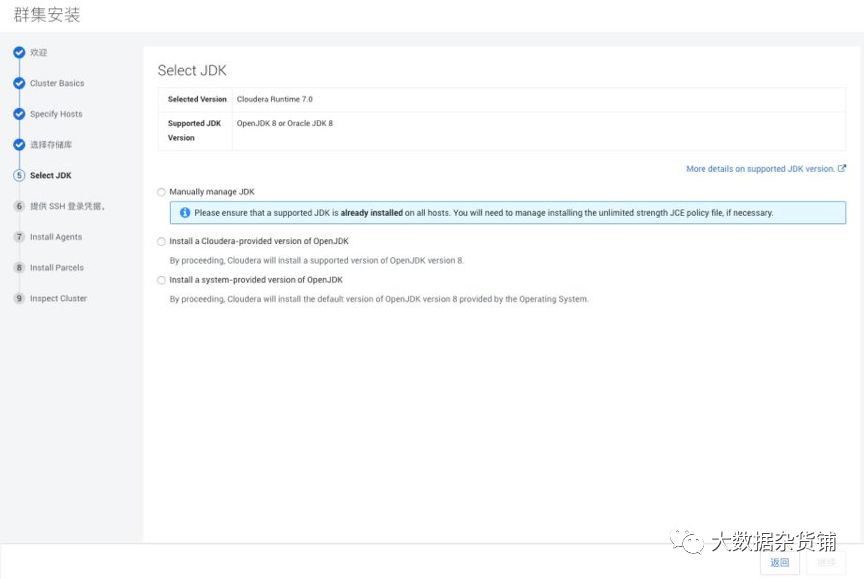 6. 点击“继续”,进入下一步安装jdk. 选择Install a Cloudera-provided versionof OpenJDK,点击继续