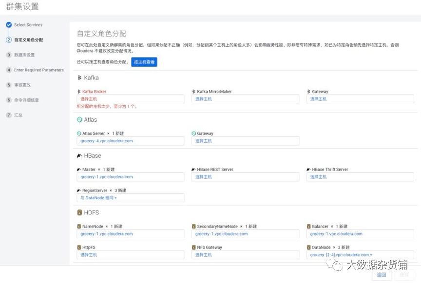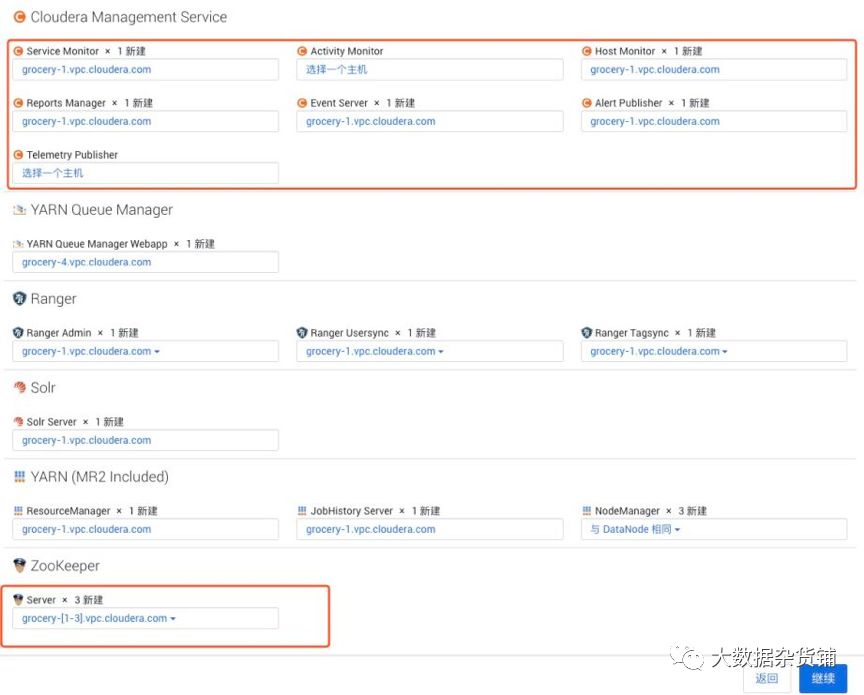 注意:Cloudera ManagementService中的Activity Monitor现在已经基本上不用,可以不安装该服务。Telemetry Publisher是遥感服务,用于Workload XM通信,如果没有计划使用Workload XM,则不需要安装该服务。ZooKeeper至少安装3节点,需要为奇数节点数。