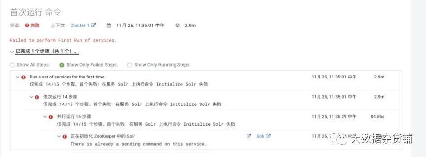 在运行命令启动服务时,报正在初始化ZooKeeper中的solr错误,重新执行即可修改该错误。