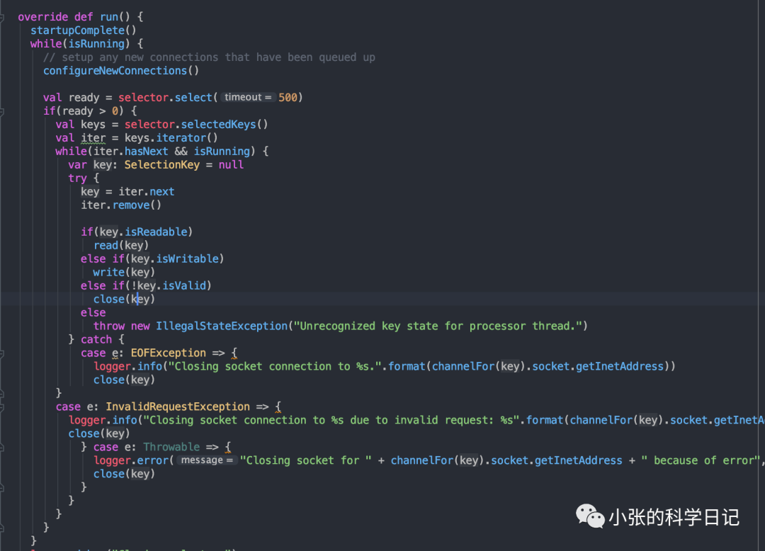 m是m个Handler,当Selector响应对应的事件后,我们需要从缓冲区读取出完整的数据(这里有一次内核空间到用户空间的拷贝),按照我们定义的协议,解析成对应的request(举个例子,kafka就是前一个short做长度,然后apikey,apiversion,correlationId等等等等),然后将这个request放到RequestChannel中,RequestChannel中维护了一个Request的队列,它还定义了Request和Response的格式等一些通用的东西,负责规范化和解耦。m个handler就从RequestChannel的Request的队列中poll出请求做处理,处理完成后生成Reponse再放到RequestChannel的Response队列中,Selector则从Response中poll出新Response,将Response对应的fd注册好写事件,等待其触发后将Response序列化后写入缓冲区(一次用户空间到内核空间的拷贝),至此一个完整的请求就处理好了。