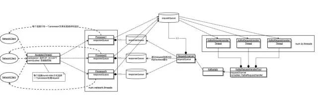 在Kafka 0.8后对这两处进行了分离,引入了一个RequestChannel组件,将网络io和磁盘io这两个职责进行了解耦,从此开始了后续版本一直沿用的1:n:m网络模型,那这个新组件和这个网络模型是如何工作的呢?