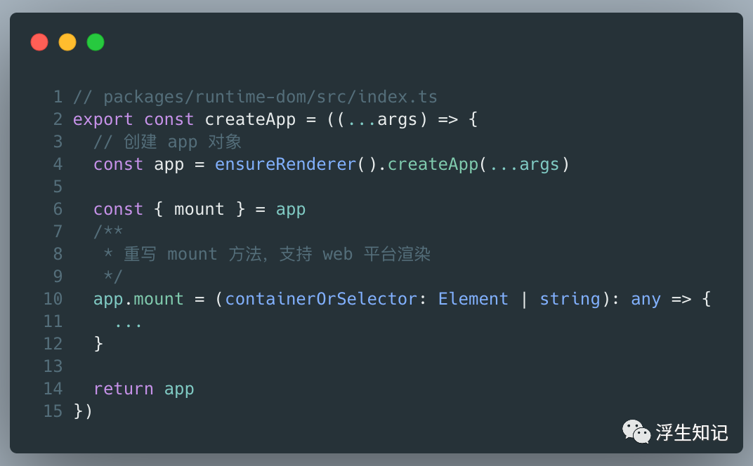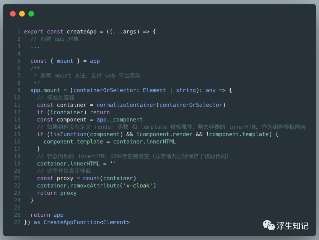 。这样,createApp 内部就创建了一个 app 对象,它会提供 mount 方法,这个方法是用来挂载组件的。