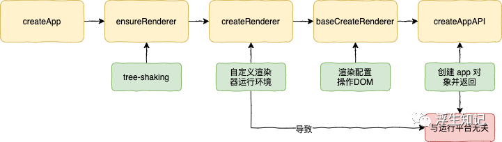 以上介绍的流程,包含了 函数柯里化、tree-shaking 等技巧,实现了参数保留,打包代码体积优化。并且通过参数实现了框架与默认运行环境(web)的解耦,可以用一张图来表示: