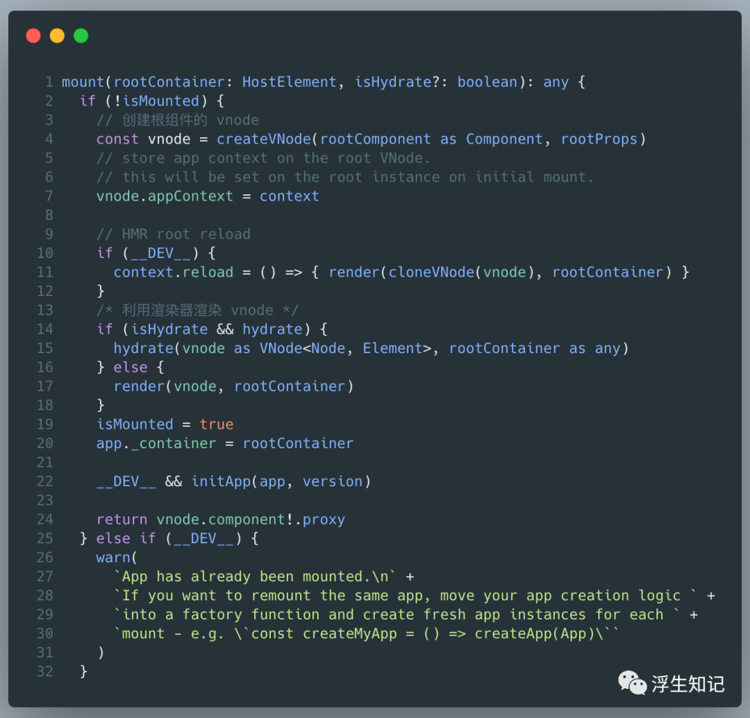 这是一个标准的跨平台渲染流程,先创建 VNode,再渲染 VNode,通过参数 rootContainer 来完成不同平台的适配。比如,在 Web 平台它是一个 DOM 对象,而在其他平台(比如 Weex 和小程序)中可以是其他类型的值,这里面的代码没有特定平台的逻辑。但是,Vue 需要有默认 web 的功能,这就需要在外部重写 mount 渲染逻辑。