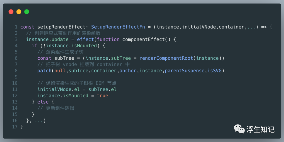 setupRenderEffect 函数内部也分成了初次渲染以及组件更新,这里只关注初始化渲染部分。这一部分做了 2 件事: