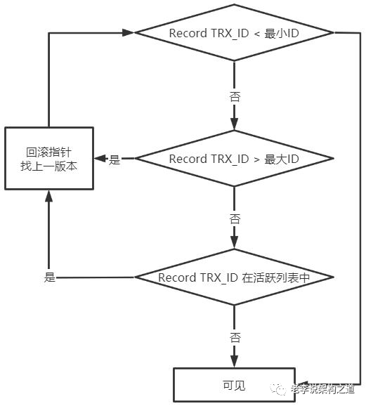 Read View:活跃事务列表(还未提交的事务) 列表中最小事务ID(提交),列表中最大事务ID(未提交);具体可见性通过如下流程图所示: