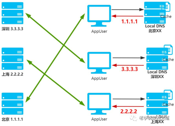智能DNS除了具备基本的DNS解析功能外,还可以自动识别DNS请求发送者来源,并将域名智能解析到不同IDC中的IP。