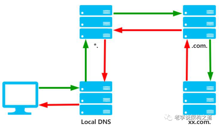 Local DNS向根发起请求,Local DNS向顶级域名DNS发起请求,Local DNS向二级域名DNS发起请求不断的迭代。